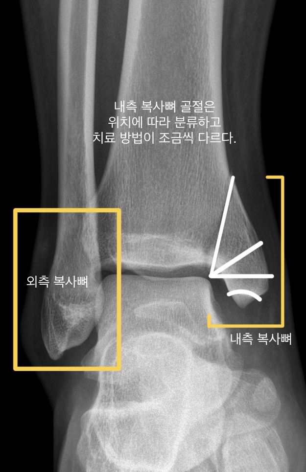 발목 내측 복사뼈 골절은 위치와 골절 정도에 따라 분류할 수 있습니다. 이에 따라 치료 및 예후가 다를 수 있습니다.